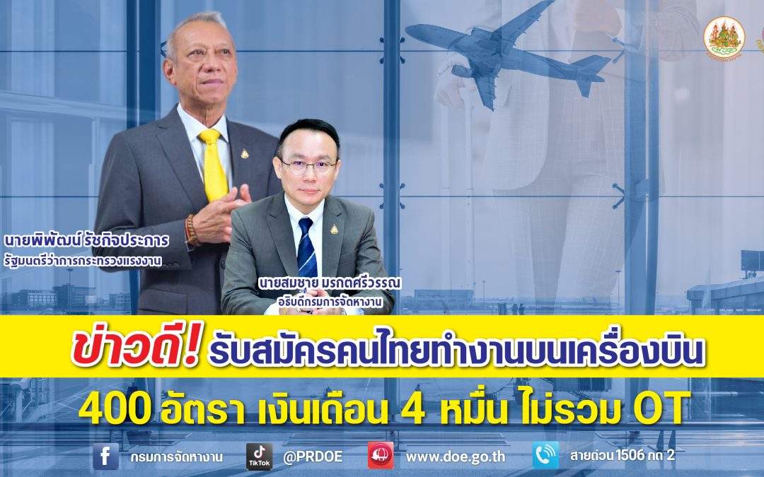 นายพิพัฒน์ รัชกิจประการ รัฐมนตรีว่าการกระทรวงแรงงาน เปิดเผยว่า กระทรวงแรงงาน โดยกรมการจัดหางานเปิดรับสมัครคนไทยไปทำงานในเขตบริหารพิเศษฮ่องกง ตำแหน่งพนักงานต้อนรับบนเครื่องบิน จำนวน 400 อัตรา กับนายจ้างบริษัท Cathay Pacific Airways Limited ซึ่งประกอบธุรกิจสายการบินทั้งภายในประเทศและระหว่างประเทศ เงินเดือน 9,100 เหรียญฮ่องกง หรือประมาณ 42,978 บาท ค่าล่วงเวลาชม.ละ 180 เหรียญฮ่องกง หรือประมาณ 850 บาท โดยมีระยะเวลาจ้างงาน 3 ปี นายจ้างจ่ายค่าเช่าที่พัก ปีที่ 1 ถึง ปีที่ 2 เดือนละ 7,000 เหรียญฮ่องกง หรือประมาณ 33,060 บาท ปีที่ 3 เดือนละ 5,800 เหรียญฮ่องกง หรือประมาณ 27,393 บาท ค่าโดยสารเครื่องบินไป-กลับ เมื่อทำงานครบสัญญาจ้าง ค่ารักษาพยาบาลของพนักงานและผู้อยู่ในอุปการะ และความคุ้มครองประกันภัย ทั้งนี้ผู้ที่สนใจสามารถยื่นใบสมัครโดยตรงที่เว็บไซต์บริษัท careers.cathaypacific.com/ ได้ตั้งแต่บัดนี้จนถึงวันที่ 11 มิถุนายน 2567 ไม่เว้นวันหยุดราชการ