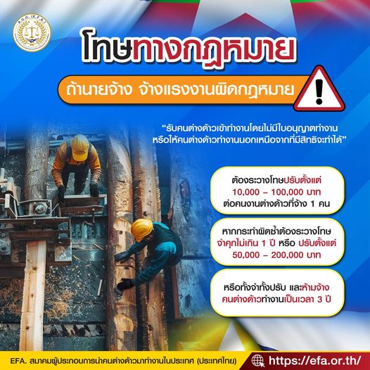 - ต้องระวางโทษปรับตั้งแต่ 10,000 - 100,000 บาท ต่อคนงานต่างด้าวที่จ้าง 1 คน